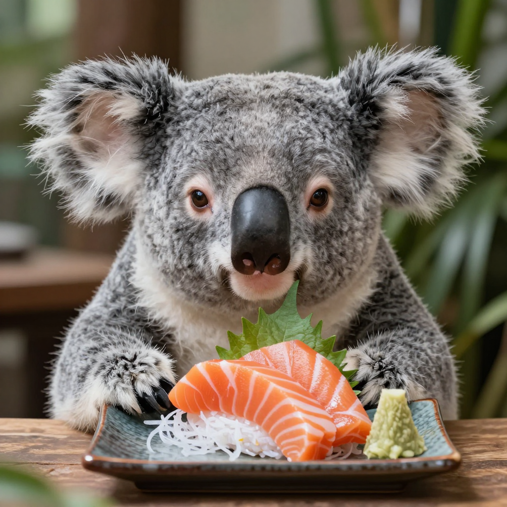 도시에서 연어 초밥 먹는 코알라 | Z-Image 이미지 by 카카오만보