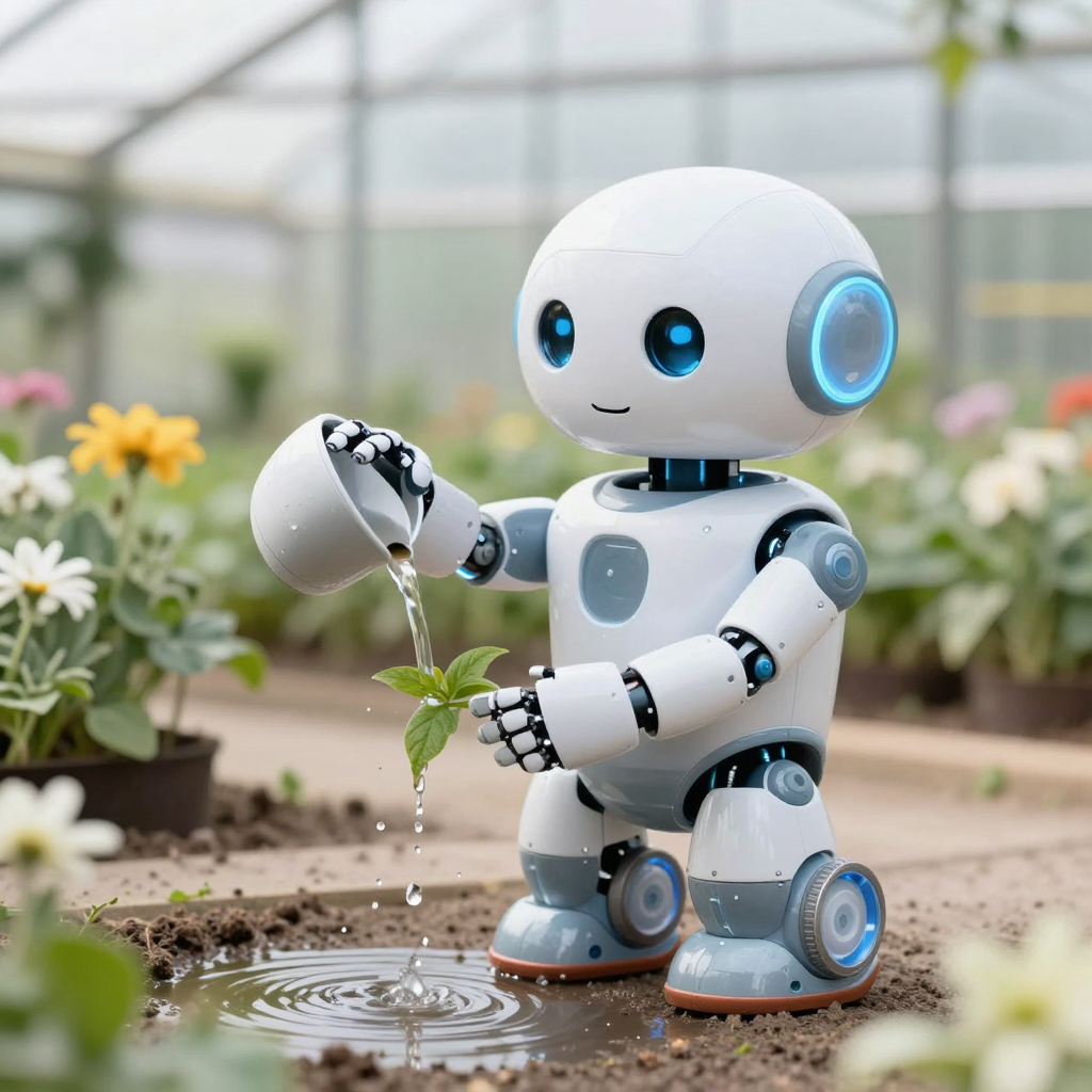 온실에서 화분에 물을 주는 귀여운 로봇 | Z-Image 이미지 by 카카오만보