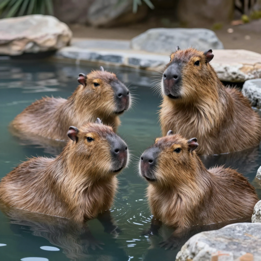 따뜻한 온천을 즐기고 있는 카피바라 가족 | Z-Image 이미지 by 카카오만보