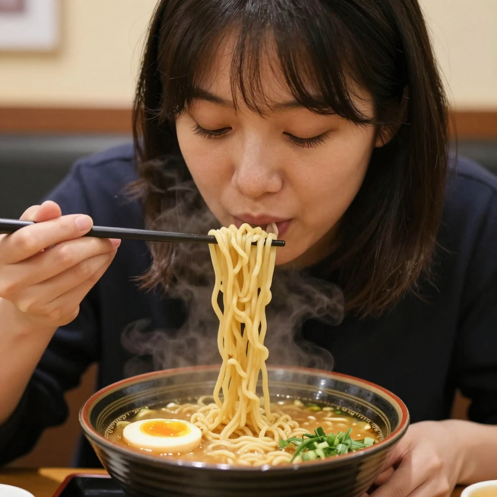 김이 모락모락 나는 실사 스타일의 라멘을 먹는 소녀