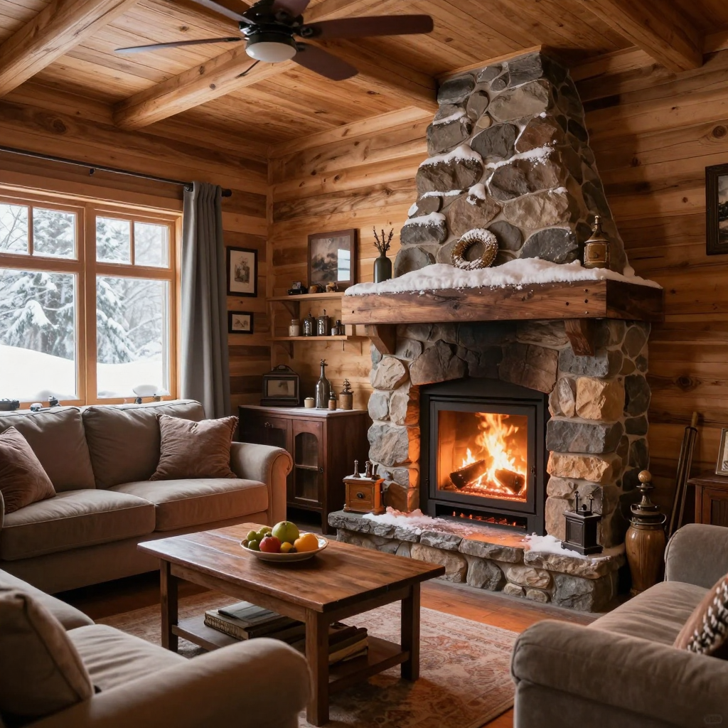 눈 덮인 산장과 따뜻한 벽난로가 있는 아늑한 거실 | Z-Image 이미지 by 카카오만보