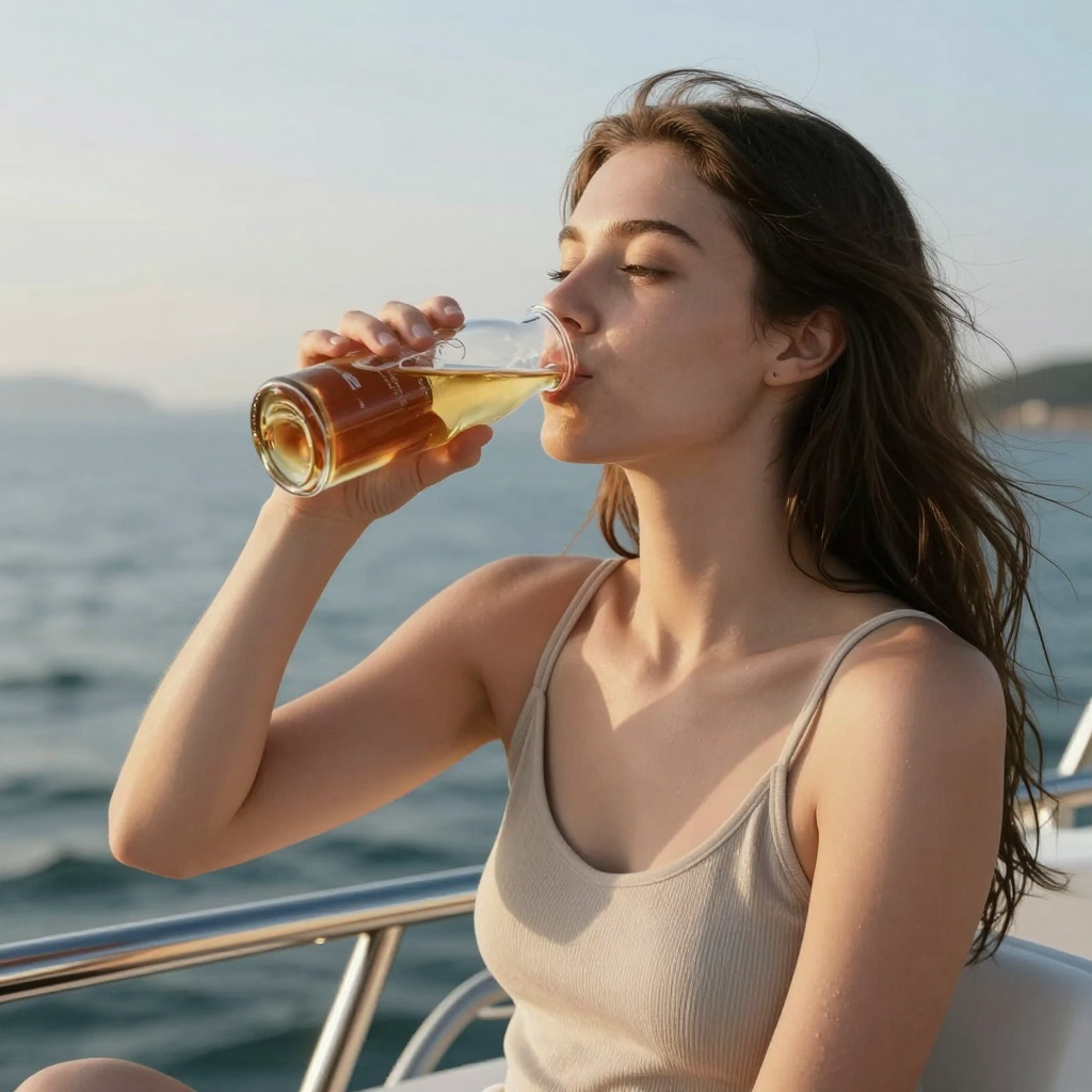 보트에서 술을 마시는 소녀