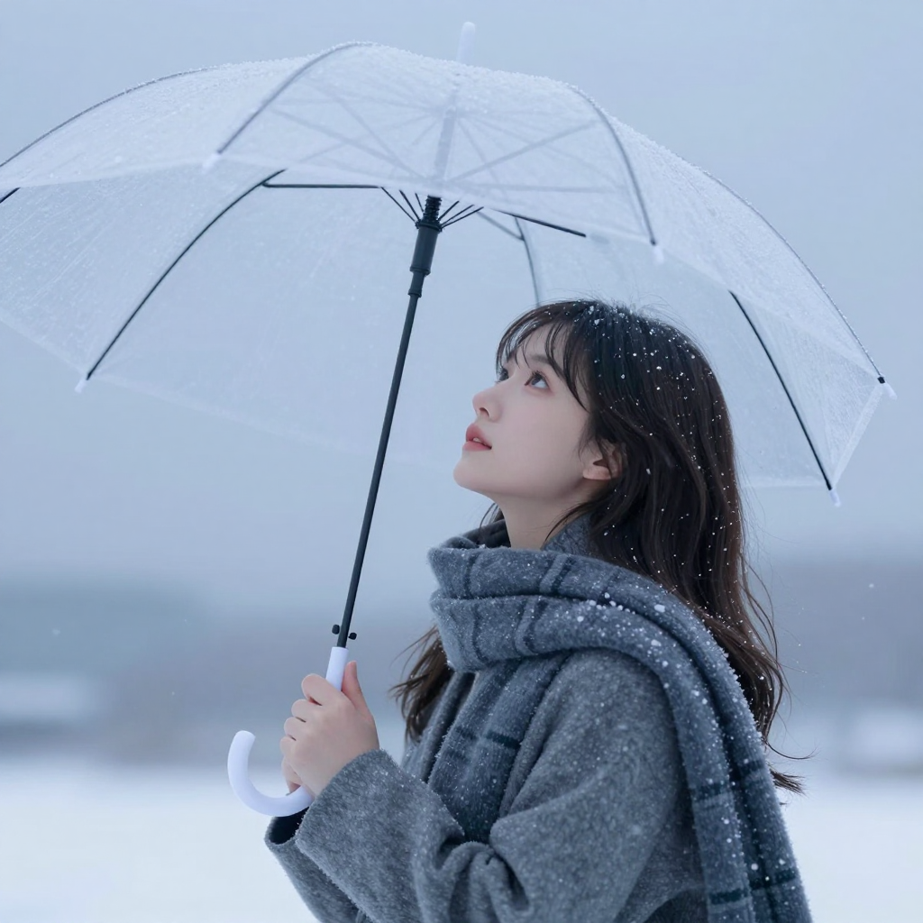 투명 우산을 쓰고 눈내리는 하늘을 보는 소녀 | Z-Image 이미지 by 카카오만보