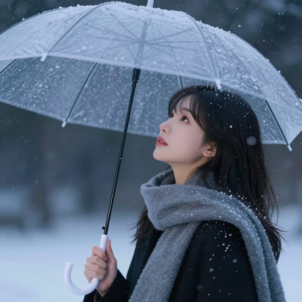 투명 우산을 쓰고 눈내리는 하늘을 보는 소녀 | Z-Image 이미지 by 카카오만보