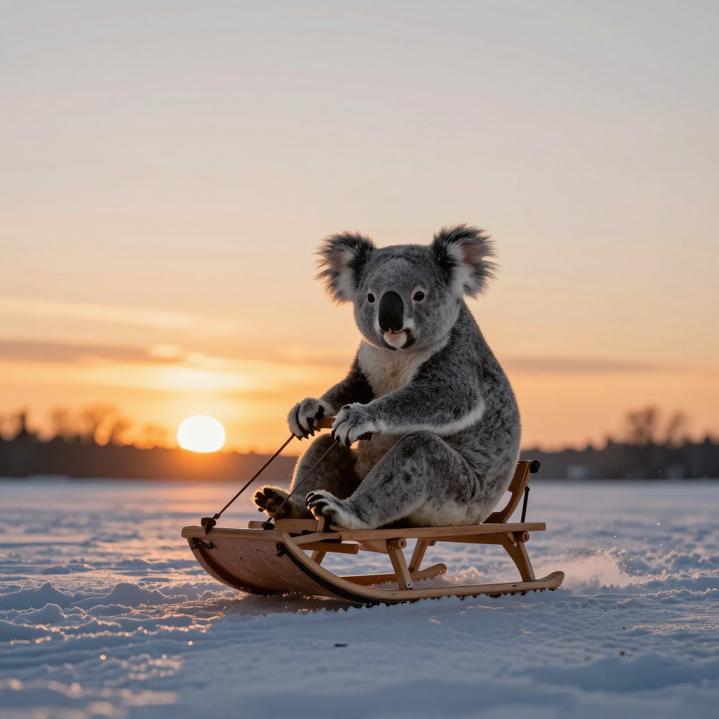 석양을 등지고 눈썰매 타는 코알라 | Z-Image 이미지 by 카카오만보
