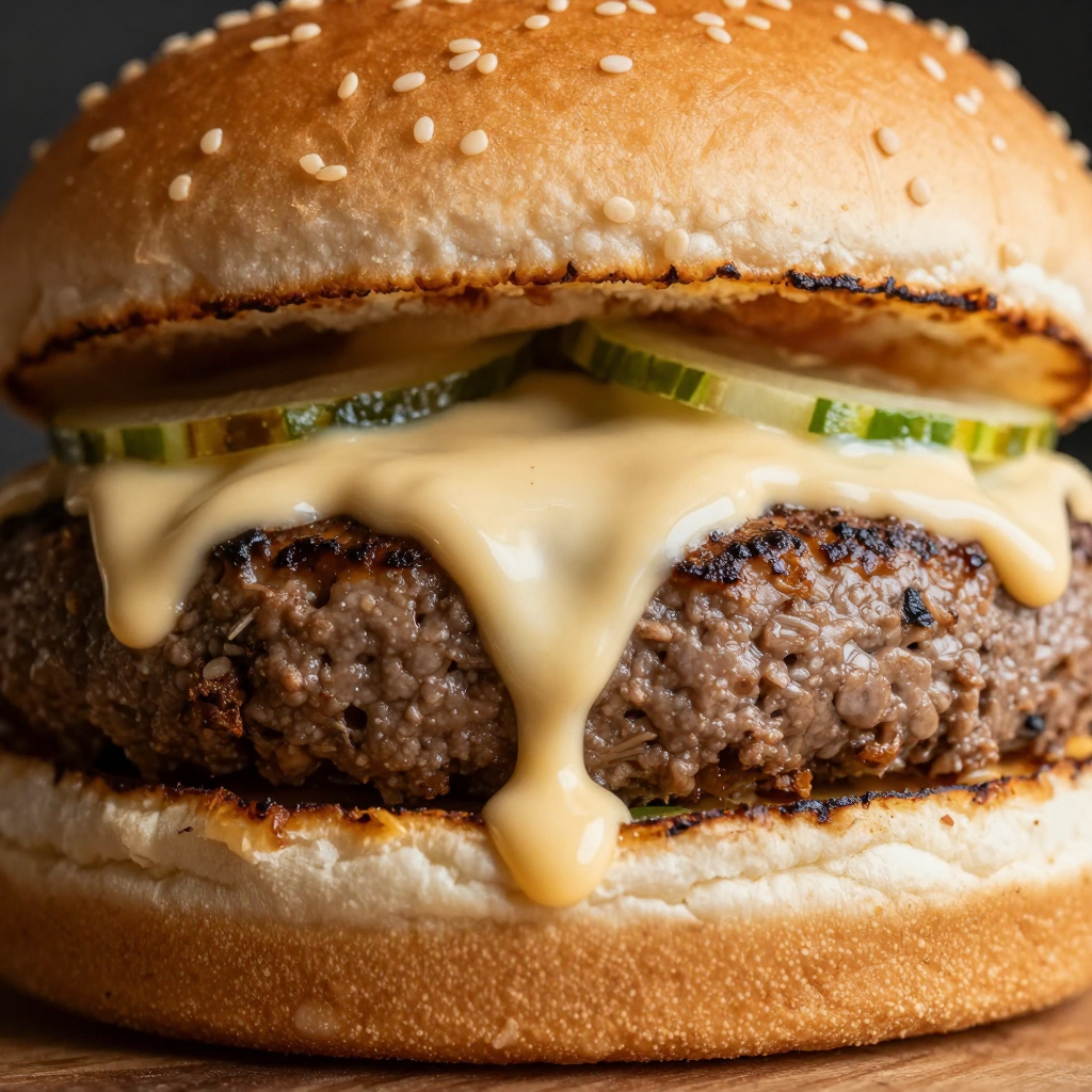 Close-up, dripping sauce, handmade burger, highly detailed, sharp focus, well composed, realistic anatomy