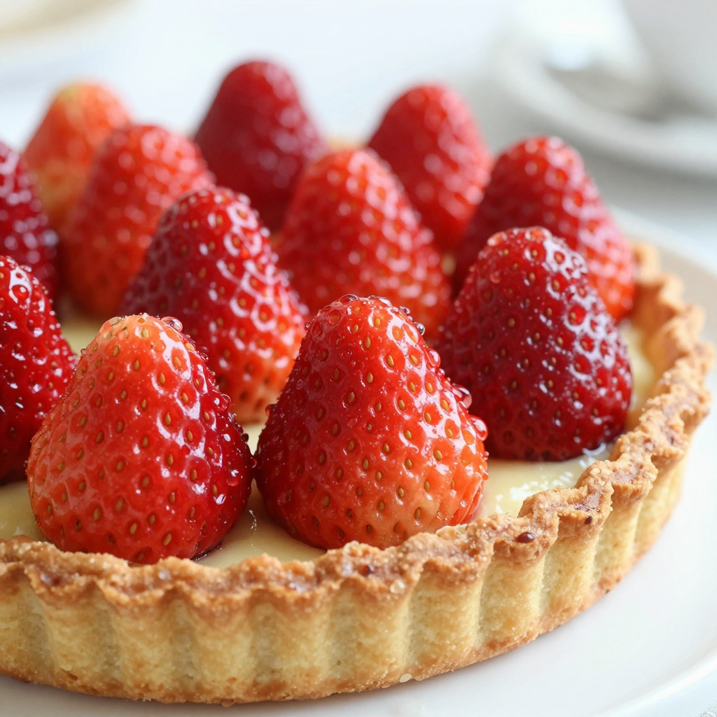 Fresh strawberry tart, water droplets, highly detailed, sharp focus, well composed, realistic anatomy, food photography