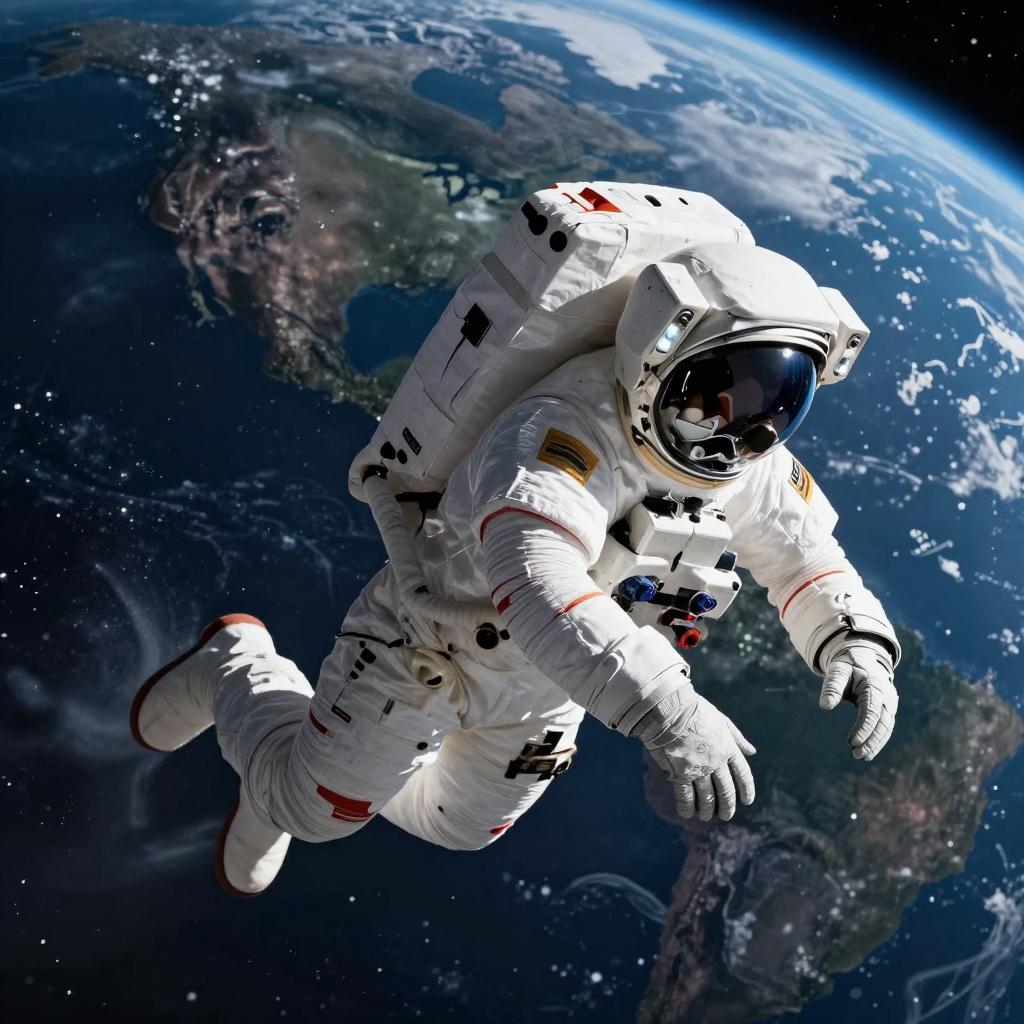 Astronaut swimming through the cosmos, Earth background, highly detailed, sharp focus, well composed, realistic anatomy