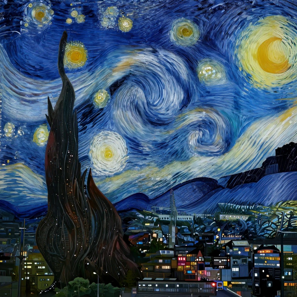 Starry Night style, Seoul cityscape, night view, highly detailed, sharp focus, well composed, realistic anatomy