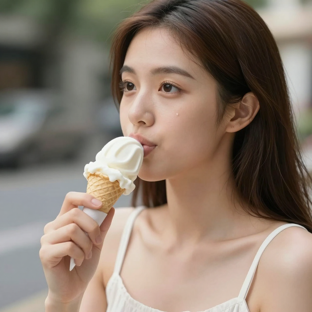 Girl eating vanilla ice cream, highly detailed, sharp focus, well composed, realistic anatomy