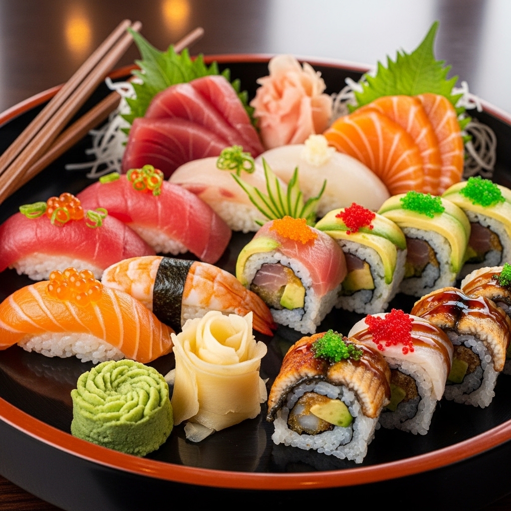 고급스러운 접시에 담긴 형형색색의 초밥 세트