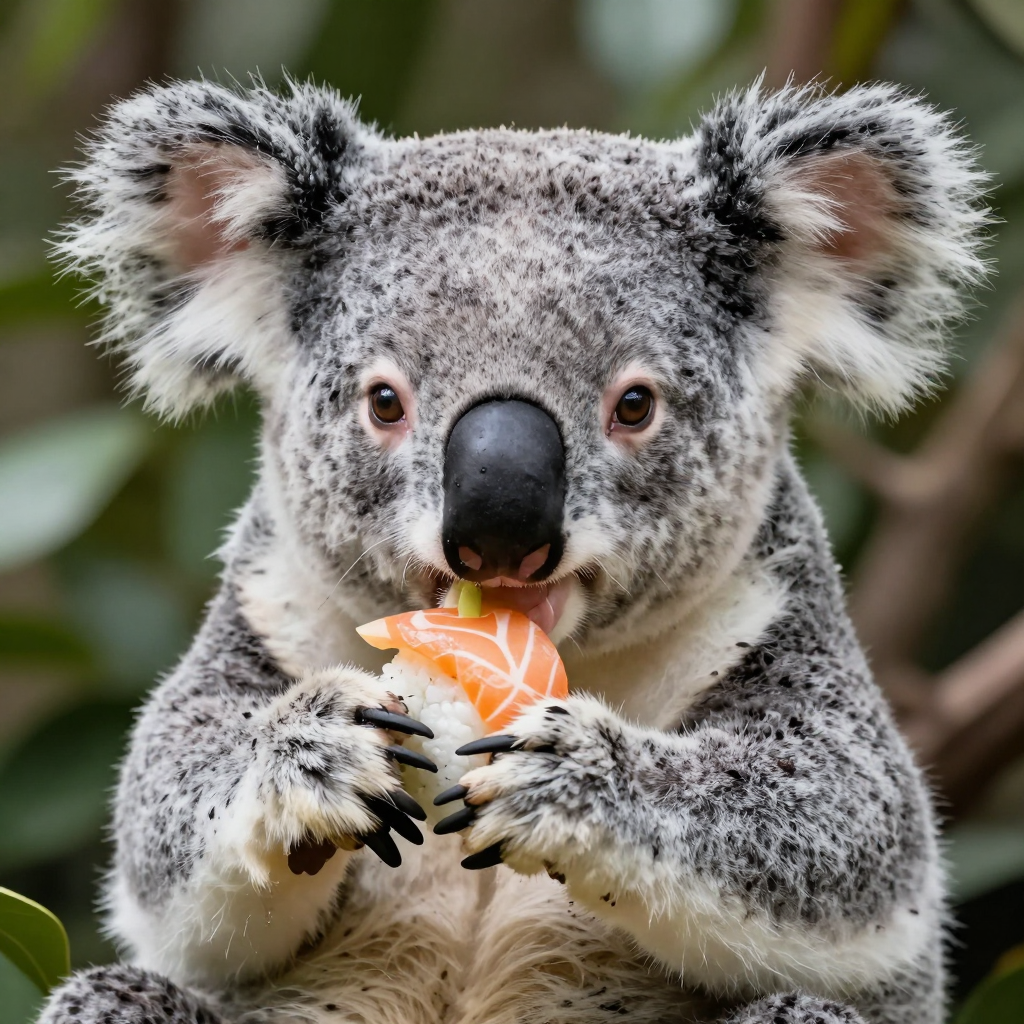Koala eating sushi, highly detailed, sharp focus, well composed, realistic anatomy, vibrant colors