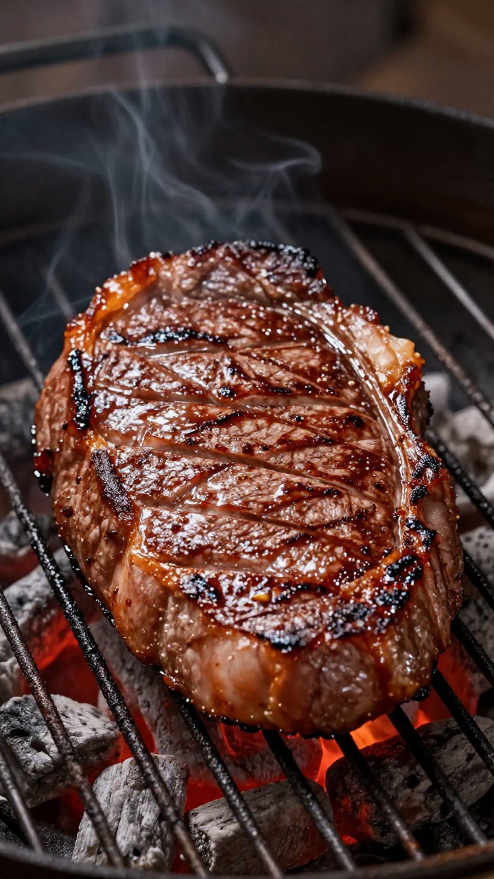 Steak sizzling on hot coals, highly detailed, sharp focus, well composed, realistic anatomy, cinematic lighting