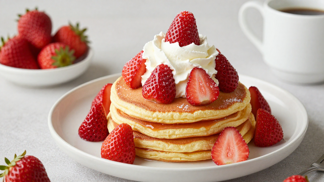 딸기와 생크림이 듬뿍 올라가 있는 팬케이크