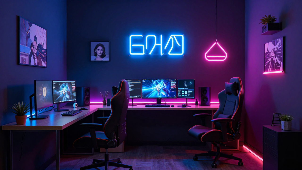 네온 조명이 켜진 아늑한 게이머의 방 (3D)