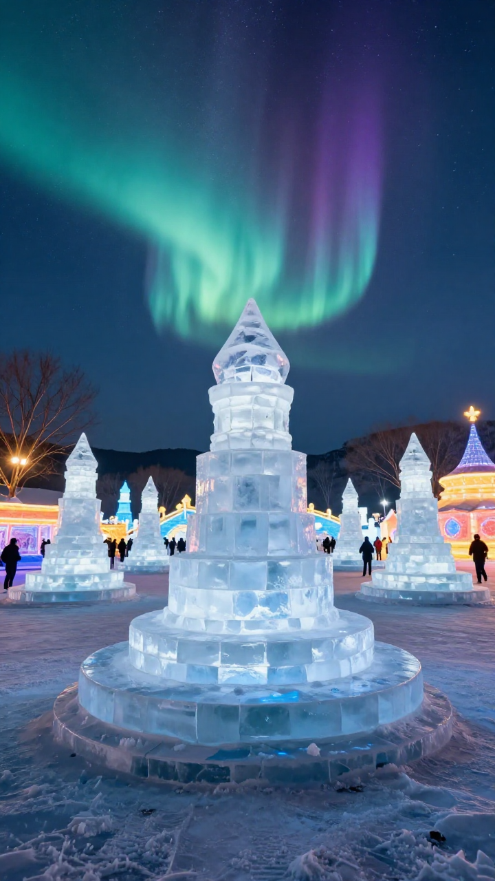 겨울 축제의 아이스 조각 공원과 오로라 하늘, 반짝이는 야경 | Z-Image 이미지 by 카카오만보