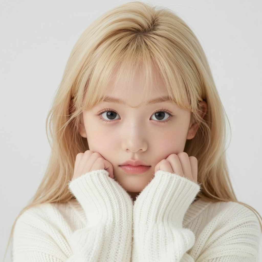 눈을 맞으며 흰색 겨울 스웨터를 입은 금발 긴머리 귀여운 소녀 | Z-Image 이미지 by 카카오만보