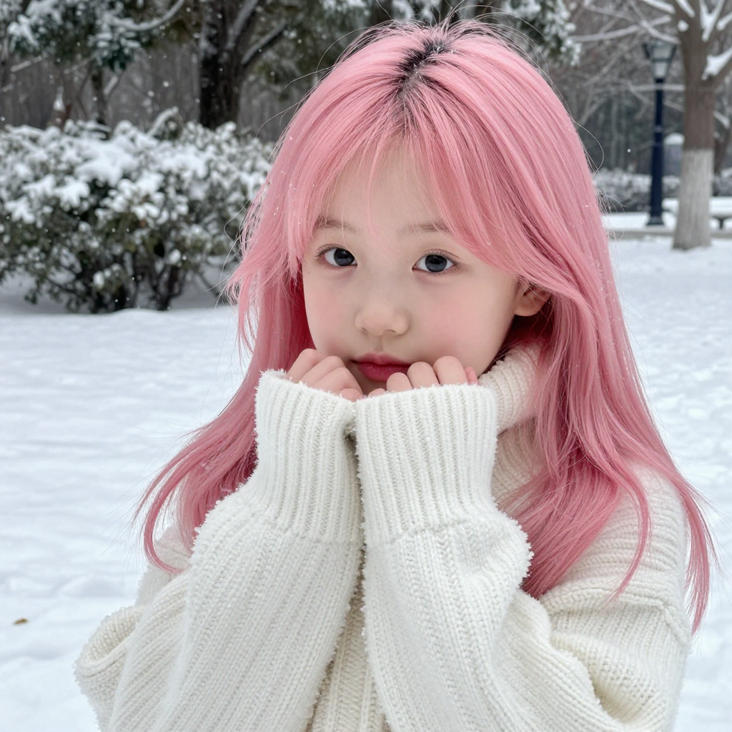 눈이 내리는 공원에서 흰색 겨울 스웨터를 입은 핑크 긴머리 귀여운 소녀 | Z-Image 이미지 by 카카오만보